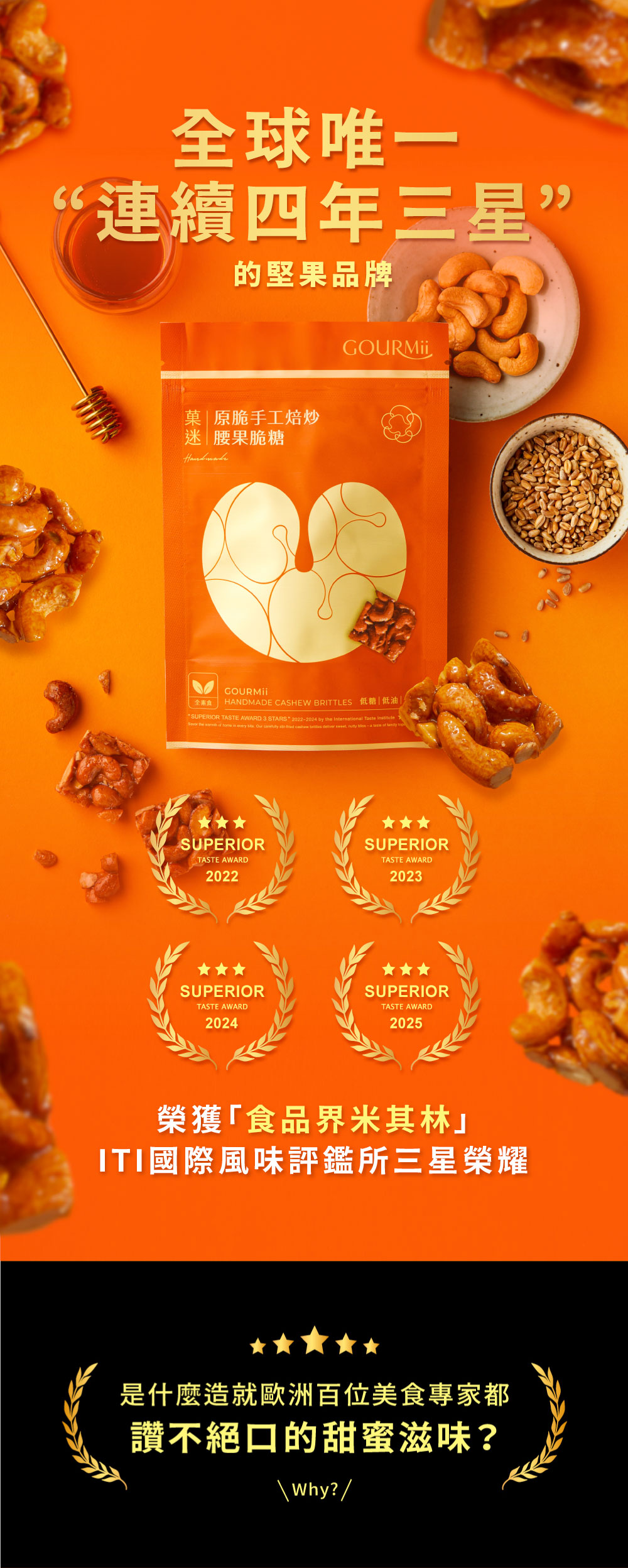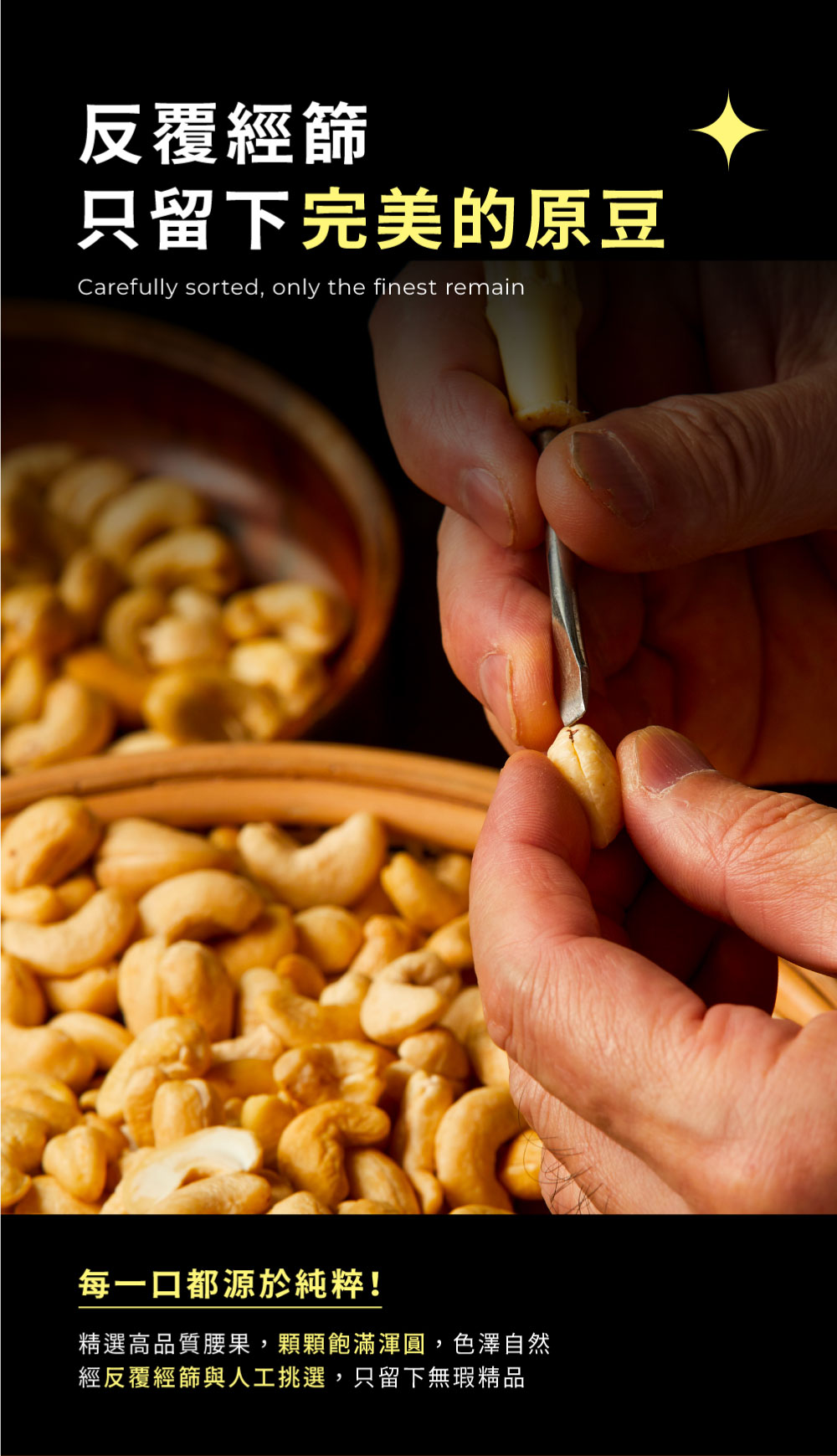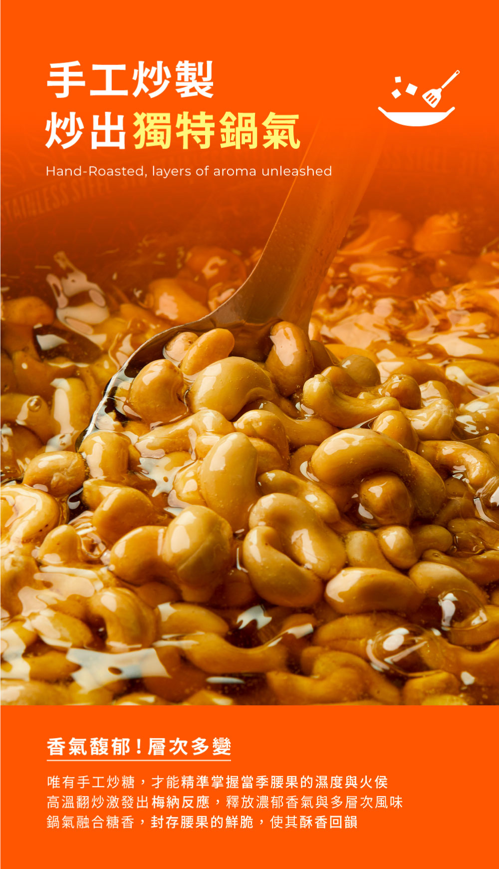 在高溫翻炒的過程,使腰果瞬間鎖住濃郁鍋氣 以適合的火候及冷卻時機,炒出腰果獨有的脆韻風味 採用低糖、低油、低塩的配方 讓您在享受豐富腰果風味的同時,無需擔心負擔。
